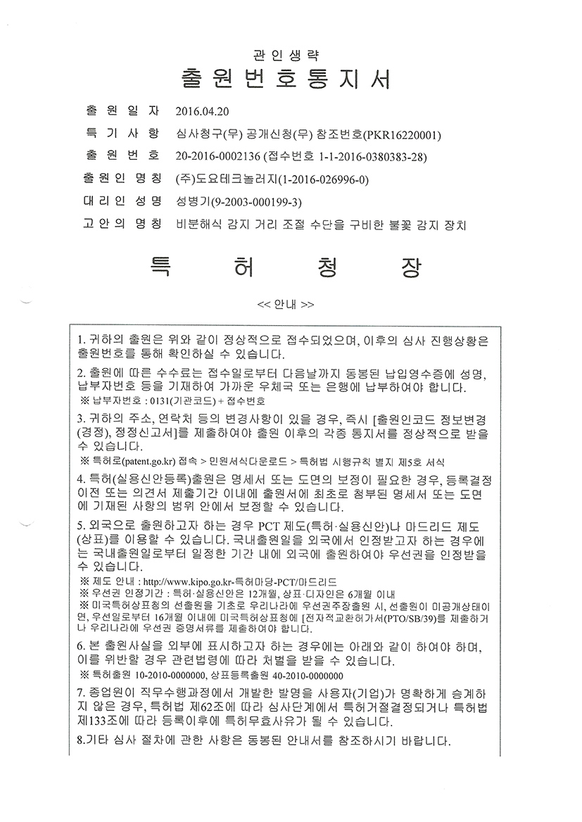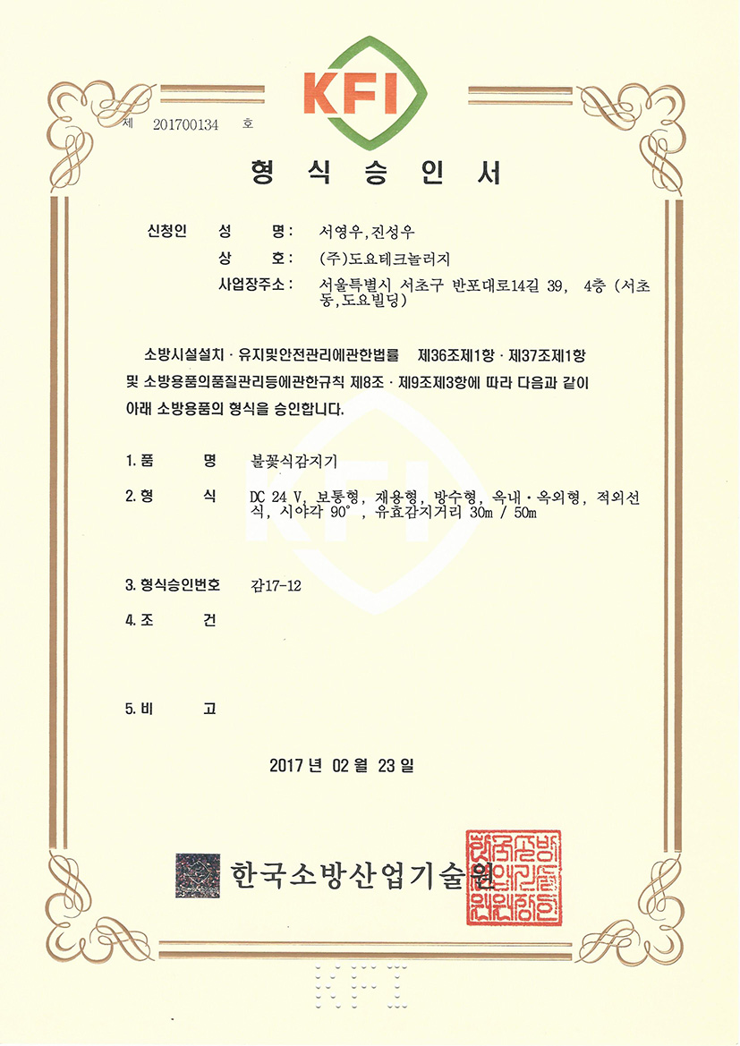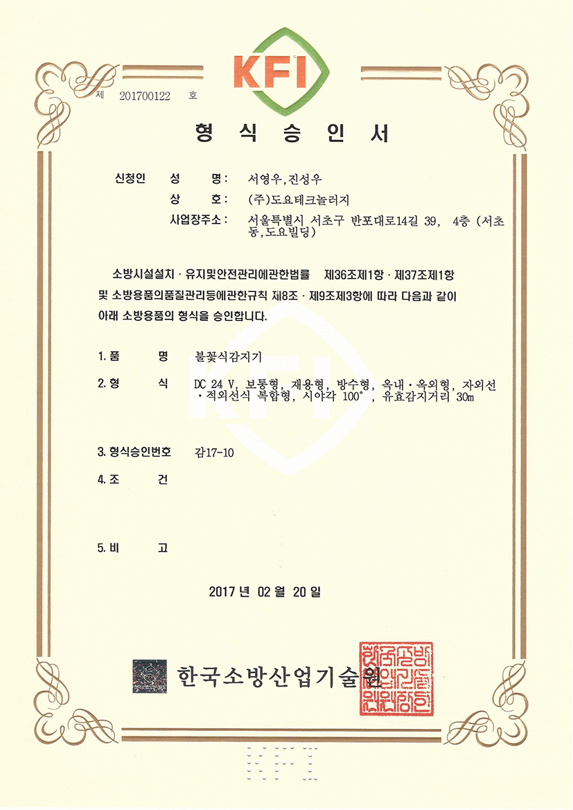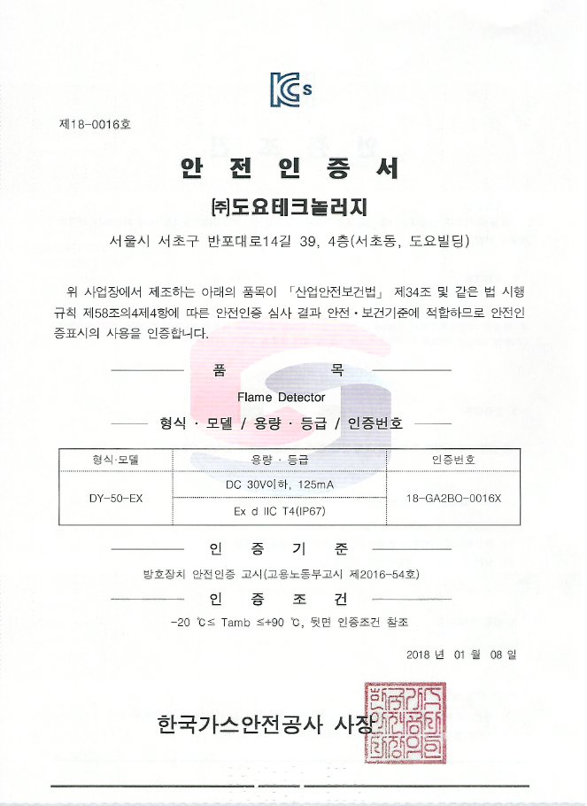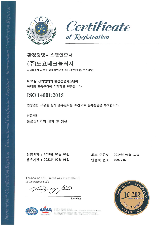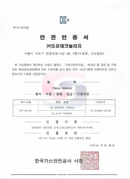 국내외인증서 납품실적 자료실 국내외 인증서 불꽃감지기 DY-50-EX (IR3 50M 방폭형) 불꽃감지기 DY-50-GEX (IR3 50M 일반형) 불꽃감지기 DYM15-CAM-GE (UV/IR 15M CAM형) 불꽃감지기 DYM50-CAM-GE(IR3 50M CAM형) 불꽃감지기 DY-30-GE (UV/IR 20M, 30M 다중감도) 불꽃감지기 DY-50-GE(IR3 30M, 50M 다중감도) 불꽃감지기 DYM30-CAM-GE(UV/IR 30M CAM형) 불꽃감지기 DYM50-GE(IR3 50M 단일감도) 불꽃감지기 DYM30-GE(UV/IR 30M 단일감도) ISO9001-2015 인증서 ISO14001-2015 인증서 전자파적합등록필증 태고종 방재 협약서 중소기업확인증 조달청등록증 (나라장터) 벤처기업확인서 기술평가 우수기업 인증서 생산자 책임보험 가입증서 서영대 산학협력 가족회사 협약서 ISO 14001 환경경영시스템인증서 ISO 9001 품질경영시스템인증서 방폭인증서 공장등록증 전문 소방시설 공사업 등록증 특허출원서 특허출원서 특허출원서 특허출원서 특허출원서 특허출원서