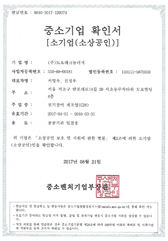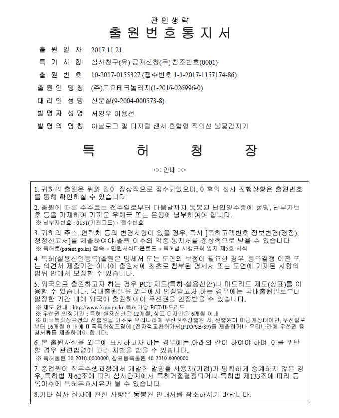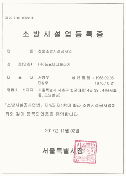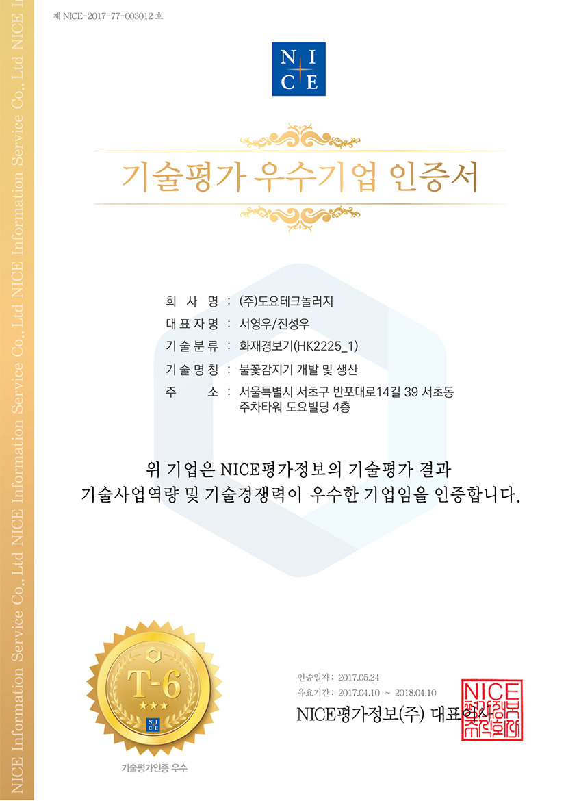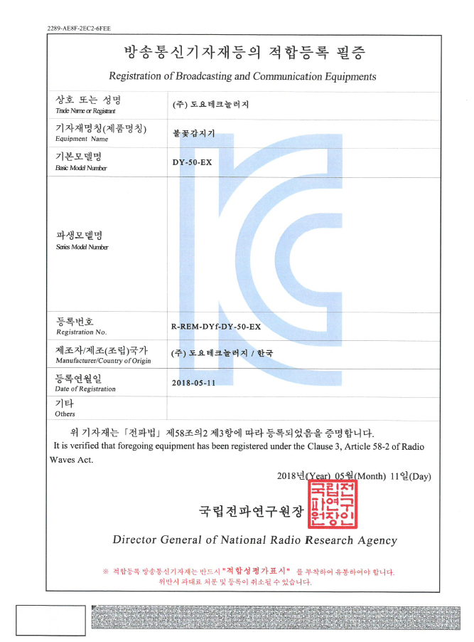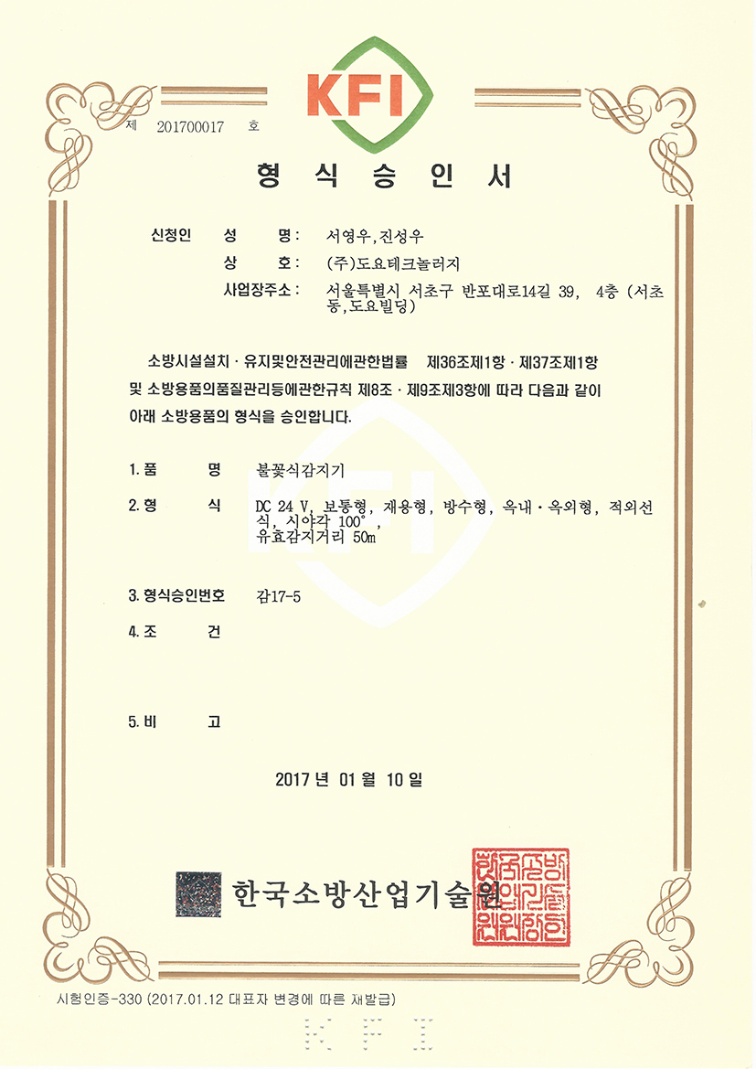 국내외인증서 납품실적 자료실 국내외 인증서 불꽃감지기 DY-50-EX (IR3 50M 방폭형) 불꽃감지기 DY-50-GEX (IR3 50M 일반형) 불꽃감지기 DYM15-CAM-GE (UV/IR 15M CAM형) 불꽃감지기 DYM50-CAM-GE(IR3 50M CAM형) 불꽃감지기 DY-30-GE (UV/IR 20M, 30M 다중감도) 불꽃감지기 DY-50-GE(IR3 30M, 50M 다중감도) 불꽃감지기 DYM30-CAM-GE(UV/IR 30M CAM형) 불꽃감지기 DYM50-GE(IR3 50M 단일감도) 불꽃감지기 DYM30-GE(UV/IR 30M 단일감도) ISO9001-2015 인증서 ISO14001-2015 인증서 전자파적합등록필증 태고종 방재 협약서 중소기업확인증 조달청등록증 (나라장터) 벤처기업확인서 기술평가 우수기업 인증서 생산자 책임보험 가입증서 서영대 산학협력 가족회사 협약서 ISO 14001 환경경영시스템인증서 ISO 9001 품질경영시스템인증서 방폭인증서 공장등록증 전문 소방시설 공사업 등록증 특허출원서 특허출원서 특허출원서 특허출원서 특허출원서 특허출원서