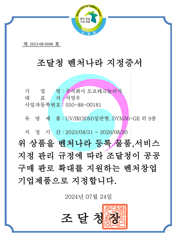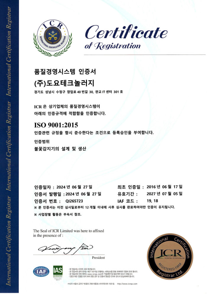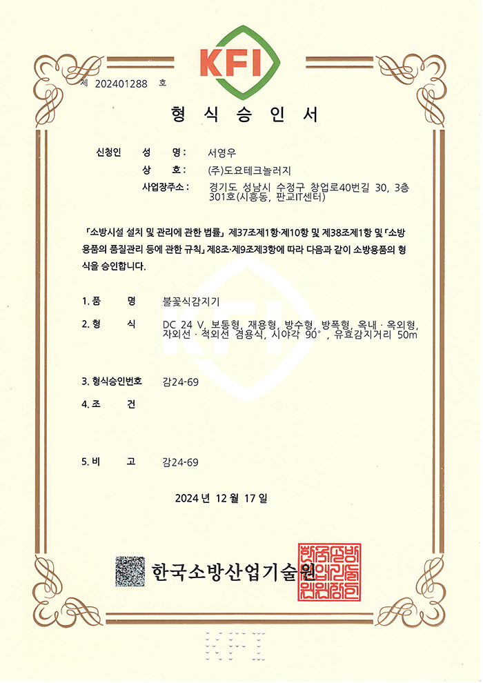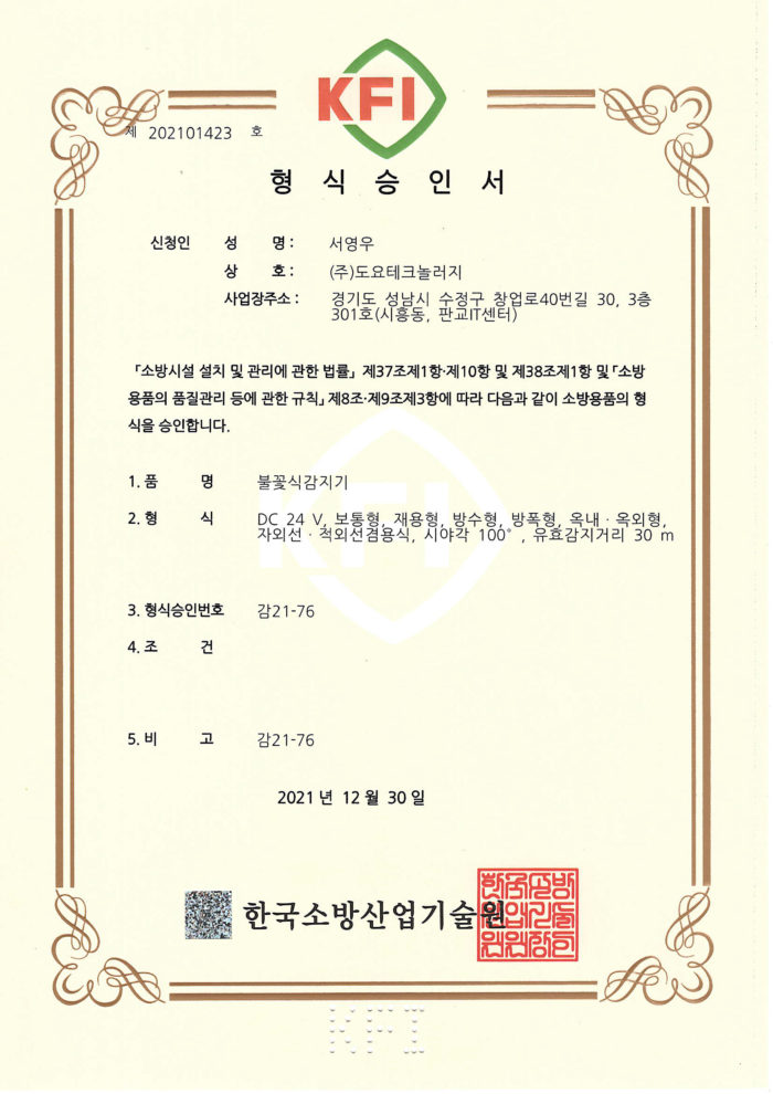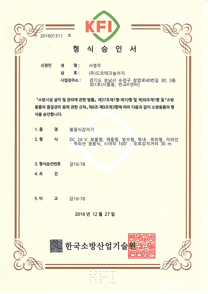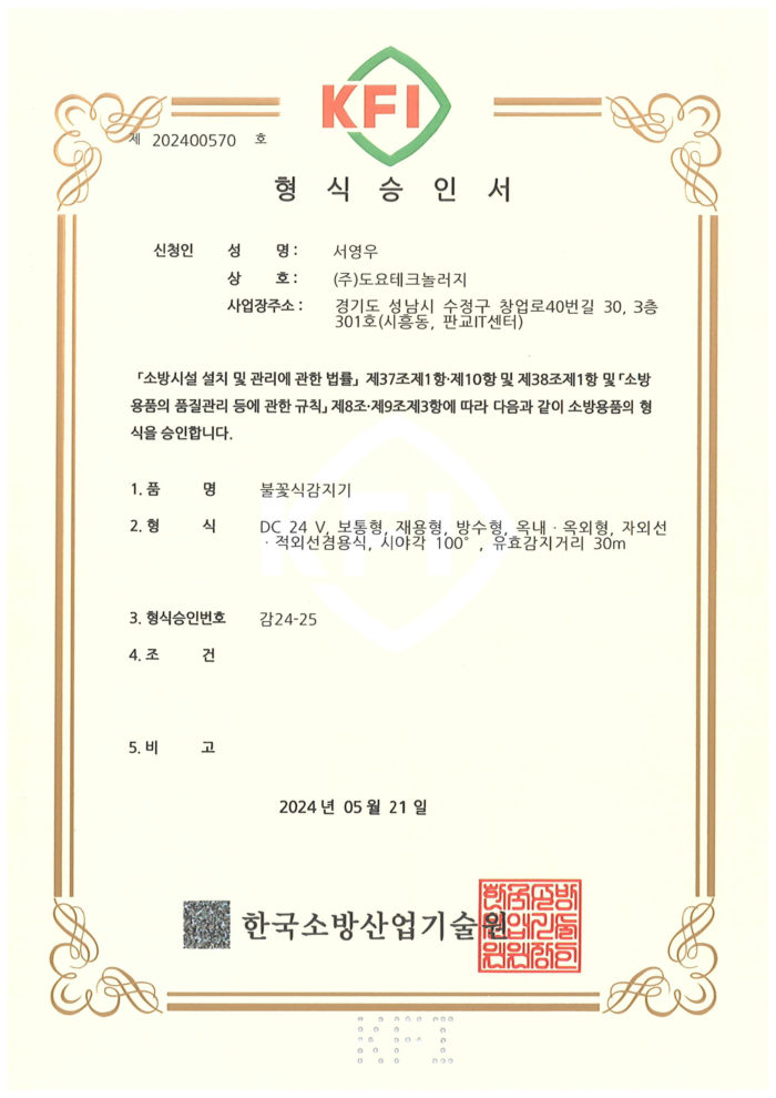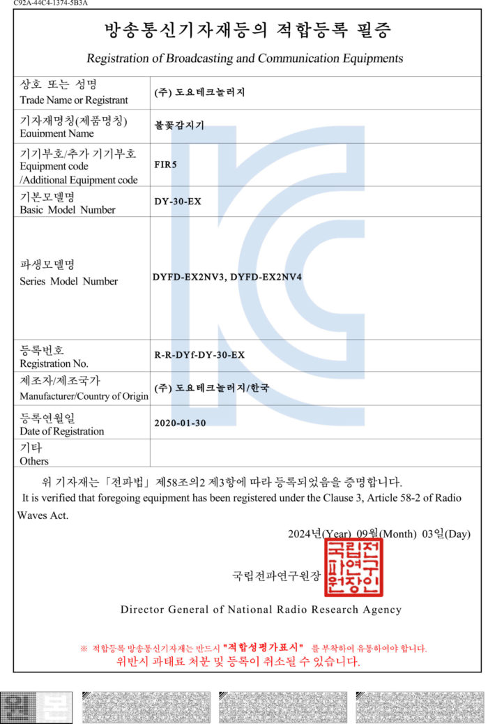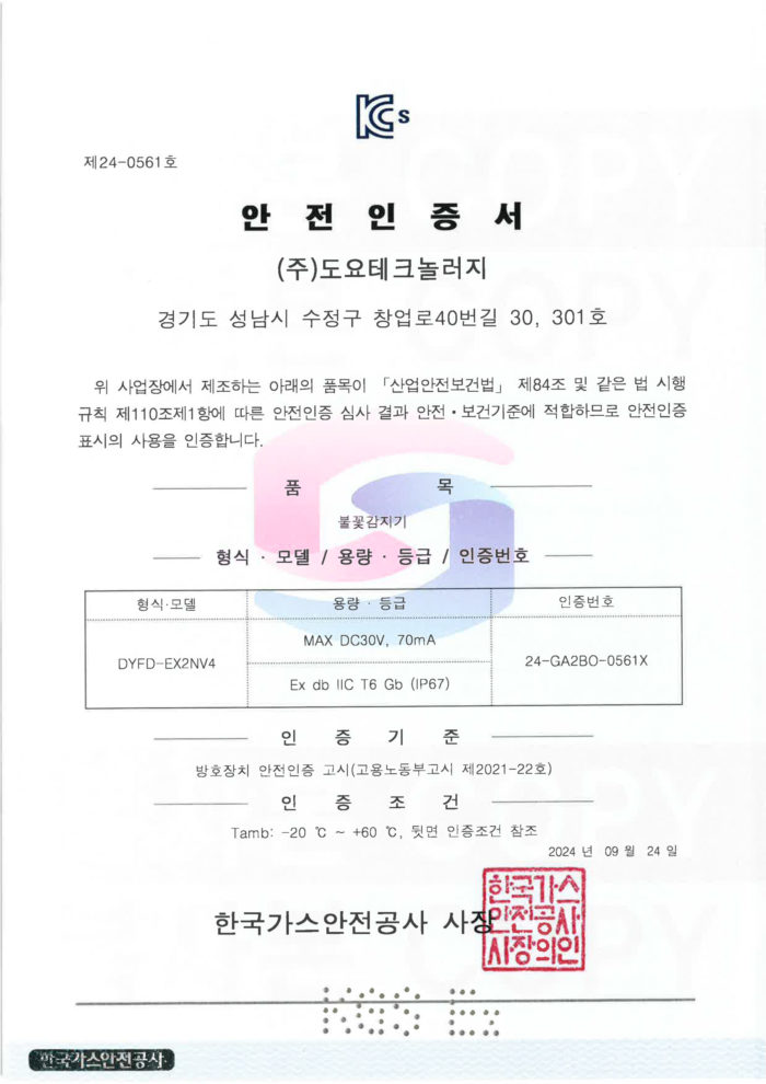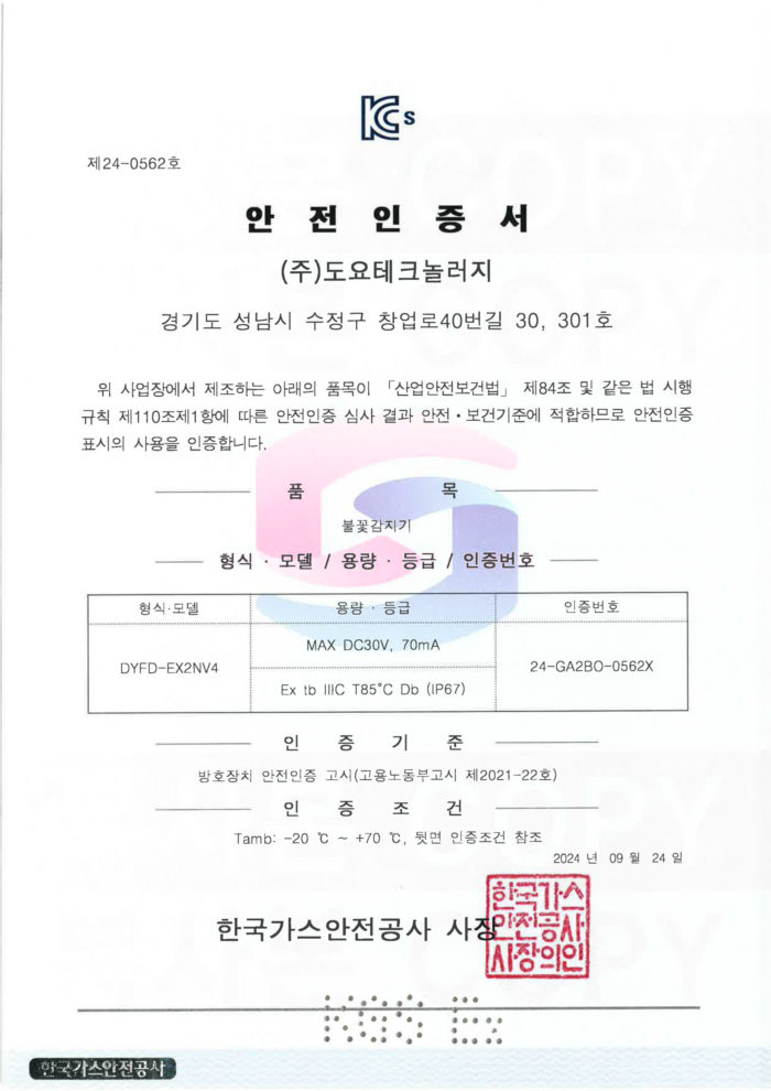 국내외인증서 KFI 시험 성적서 납품실적 자료실 KFI 형식승인서 DYM-30-GE(UV/IR일반형) DYM-50-GE(IR3일반형) DYM50-GE2(IR3일반형) DYM30-CAM-GE(UV/IR/CAM일반형) DYM50-CAM-GE(IR3/CAM일반형) DYM30-CAM-GIP(UV/IR/IPCMA일반형) DYM50-CAM-GIP(IR3/CAM일반형) DYFD-EX1NV3(IR3방폭형) DYFD-EX2NV3(UV/IR방폭형) DYFD-EX2NV4(UV/IR방폭형) DYFD-EX2CV5(UV/IR/CAM방폭형) KGS 방폭인증서 DY-30-EX1(UV IR) 내압 방폭인증서 DY-30-EX1(UV IR) 분진 방폭인증서 DY-50-EX1(IR3) 내압 방폭인증서 DY-50-EX1(IR3) 분진 방폭인증서 DYFD-EX1CV5(IR3 CAM)내압방폭인증서 DYFD-EX1CV5(IR3 CAM)분진방폭인증서 DYFD-EX2CV5(UV IR CAM)내압방폭인증서 DYFD-EX2CV5(UV IR CAM)분진방폭인증서 DYFD-EX2NV4(UVIR)분진 방폭인증서 DYFD-EX2NV4(UVIR)내압 방폭인증서 전자파 적합 등록증 DYM50-CAM-GE전자파적합등록증 DYFD-EX2CV4 전자파적합등록증 DYM30-CAM-GE전자파적합등록증 DYM-30-GE 전자파적합등록증 DY-30-EX1 전자파적합등록증 DY50-CAM-EX 전자파적합등록증 DY-50-EX1 전자파적합등록증 DY30-CAM-EX 전자파적합등록증 DY-50-EX 전자파적합등록증 DYM50-CAM-GIP_전자파적합등록필증 DYM50-GE2_전자파적합등록증 DYM30-CAM-GIP_전자파적합등록필증-2 RC_R.ozr DYFD-EX2NV4 전자파 적합 등록증 특허증 특허_제10-1993658호 특허_제10-1993660호 특허_제10-1975861호 특허_제10-1924854호 특허_제10-1953878호 특허 제 10-2849183호 특허 제 10-2849187호 실용신안 실용_제 20-0498628호 실용_제 20-0498629호 ISO인증서 ISO14001-2015 인증서 ISO 9001_2015 인증서 벤처기업 확인서 벤처기업 확인서 기타 등록 및 인증서 전문 소방시설 공사업 등록증 태고종 방재 협약서 중소기업확인증 기술평가 우수기업 인증서 조달청등록증 (나라장터) 서영대 산학협력 가족회사 협약서 조달청 벤처나라 지정증서 성남_공장등록증명서